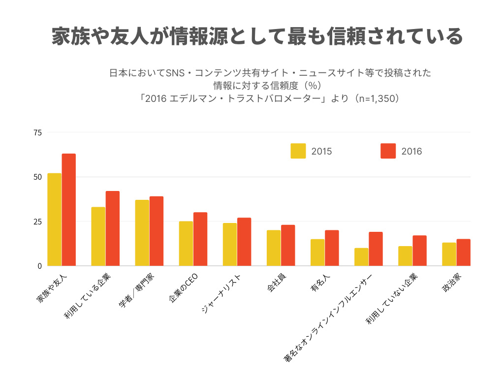 2016年のエデルマン・トラストバロメーター(信頼度調査)によると、人が情報源として最も信頼するものは「家族や友人からの情報」という結果が出ており、身近な存在からの紹介を信用することが分かっています。