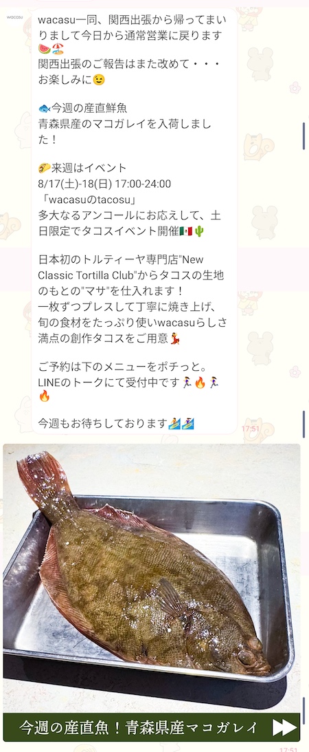 お茶割り専門店「茶割」の姉妹店「wacasu」(東京都目黒区)では、毎週の営業日初日に「その週の目玉食材」を告知する、画像とテキストを1つのビジュアルにまとめられる「リッチメッセージ」で予約フォームに遷移する導線を設置する、といった形でLINE公式アカウントを活用しています。